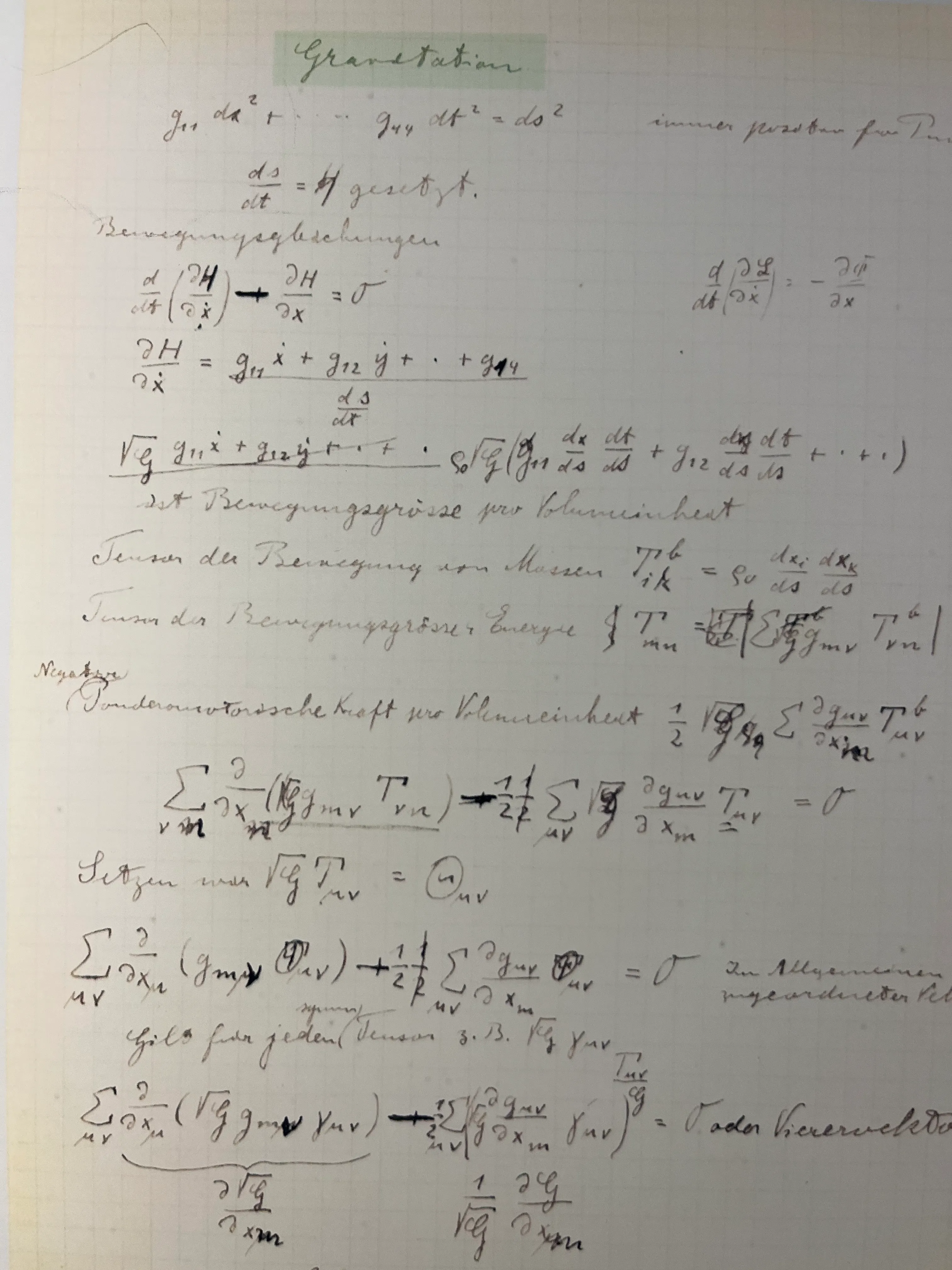 Update 31.08.2025: The following is an excerpt from one of Einstein’s research notebooks from around 1912, during his collaboration with Grossmann. I found this picture at an exhibition in Einstein’s former apartment in Bern. The Euler–Lagrange equation, written in its traditional form, appears at the top right of the page under the title Bewegungsgleichungen -equations of motion-.
